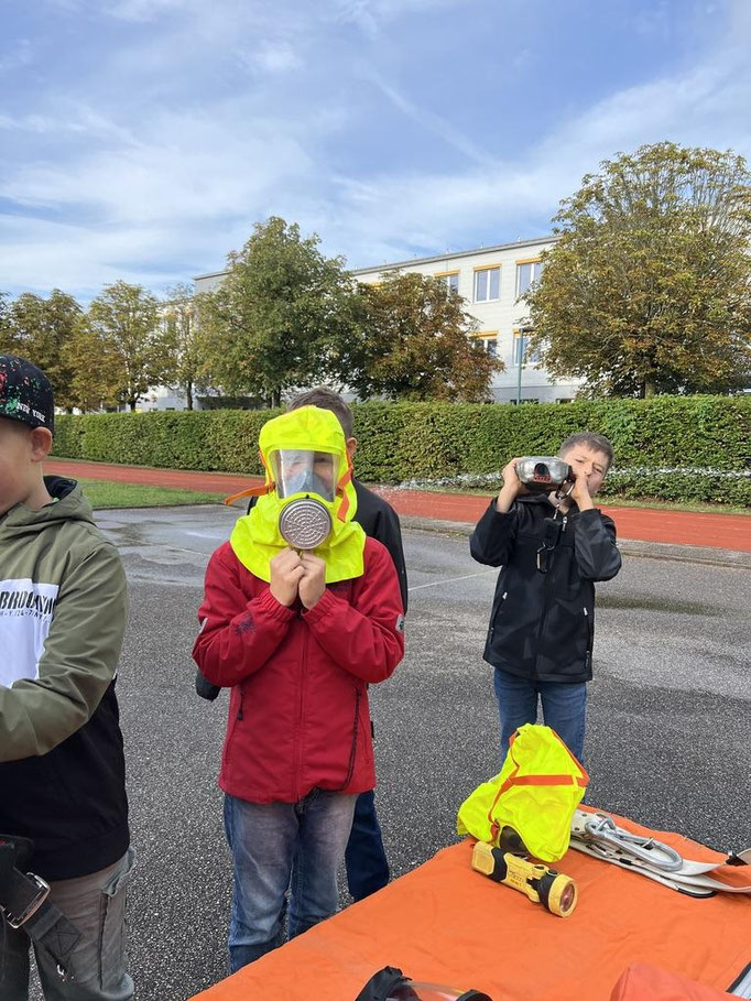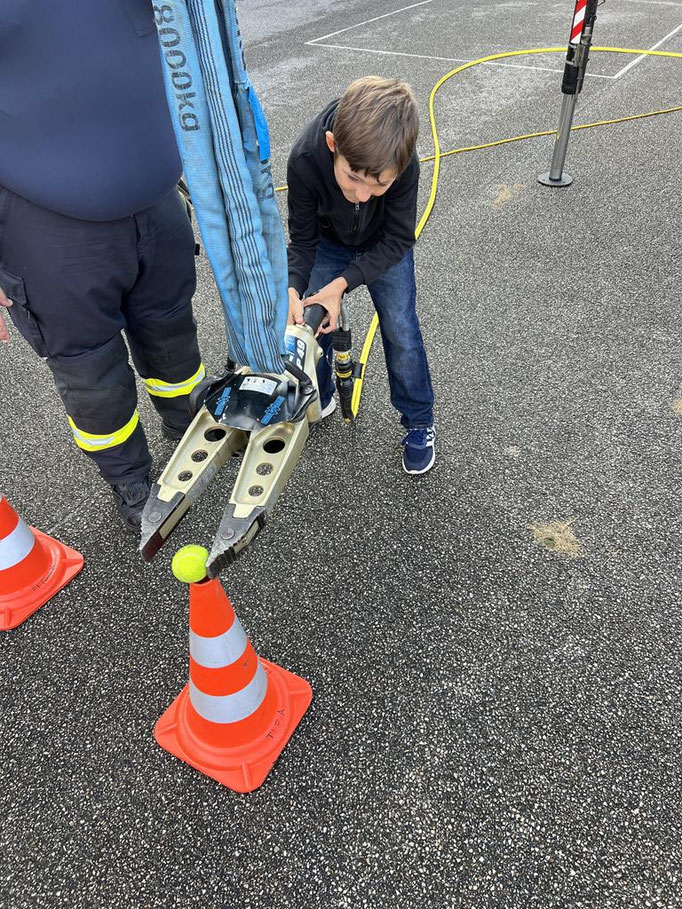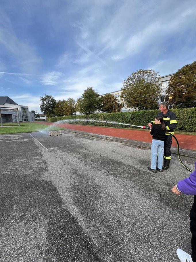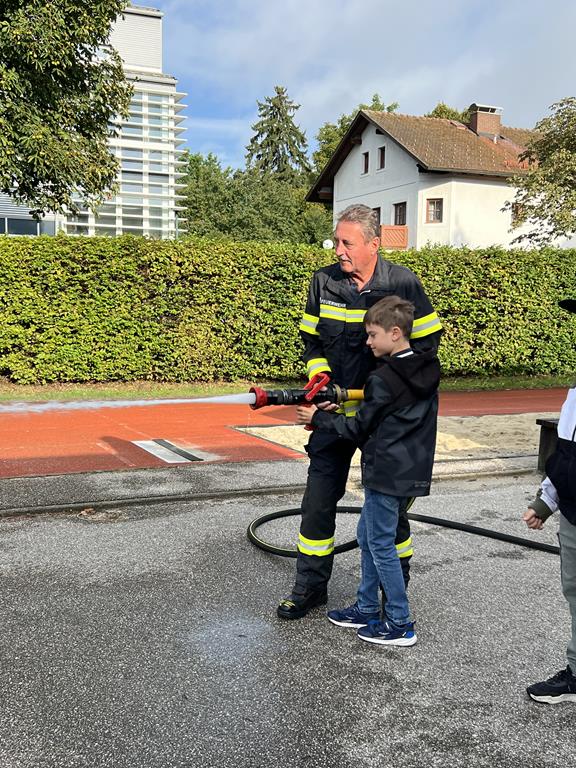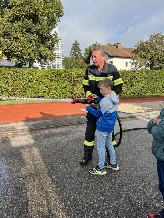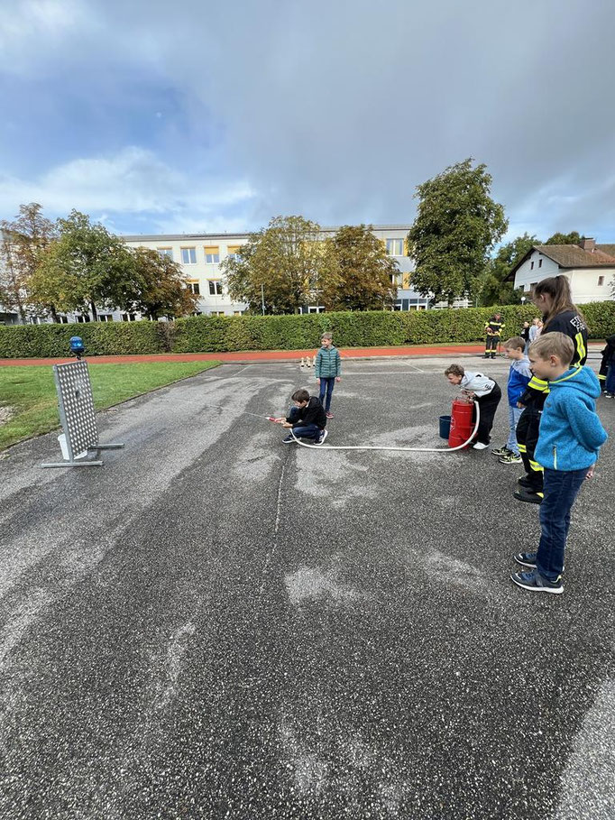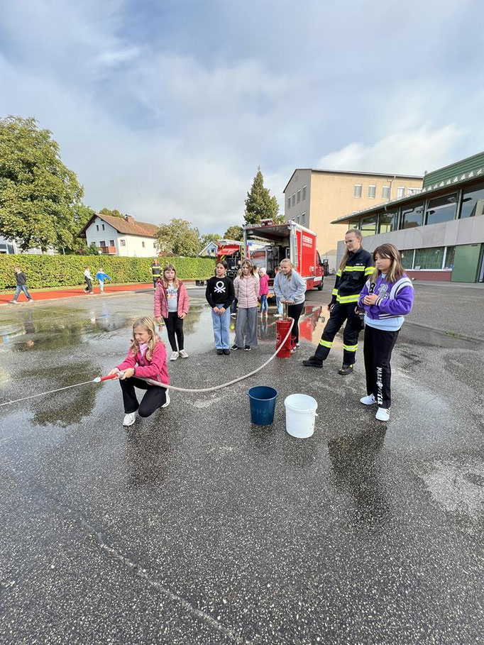 Voller Begeisterung wurde in Stationen ganz viel Wissen erworben und Können ausprobiert. So durften die Schülerinnen und Schüler mit einem "Spreizer" einen Tennisball transportieren und mit Hilfe eines Wasserschlauchs Kegel umwerfen. Beim Zielspritzen waren Kraft, Ausdauer, Zielgenauigkeit und Teamarbeit gefragt. Weiters durften die Kinder Schutzkleidung anprobieren und merkten, wie schwer eine Jacke, ein Feuerlöscher oder ein Helm wiegt. Und schließlich nahmen die Schüler und Schülerinnen noch im Feuerwehrauto selbst Platz. Sie durften mitfahren und sogar die Sirene kurz ausprobieren.