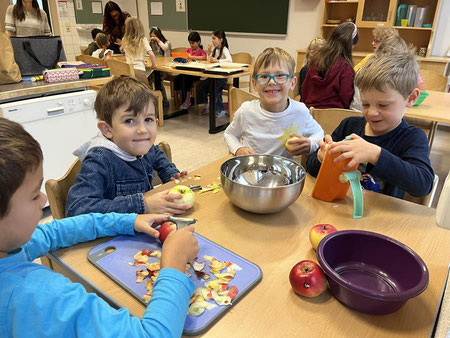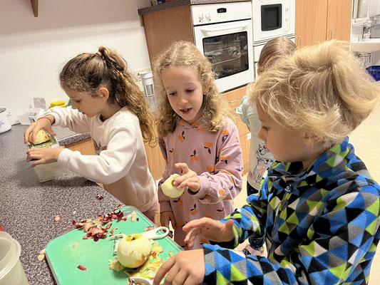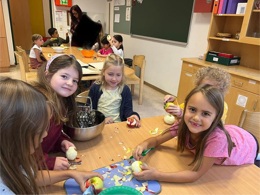 In den letzten Wochen beschäftigten sich die Schüler und Schülerinnen in Sachunterricht und Kunst mit der roten, süßsauren Herbstfrucht. Begeistert waren sie, als sie zum Abschluss in der Küche gemeinsam ein Apfelstrudel backten. Emsig wurde geschält, gehobelt, geraspelt, gerührt, Butter geschmolzen, der Teig befüllt.